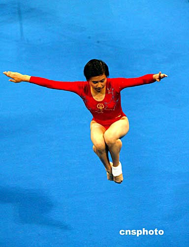 中國女子體操隊主力張楠在15日舉行的的雅典奧運會女子體操團(tuán)體賽預(yù)賽中。中新社記者:王瑤