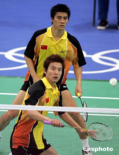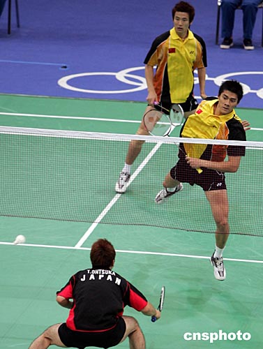 當?shù)貢r間八月十六日,參加雅典奧運會男子羽毛球雙打比賽的中國選手蔡赟、付海峰,以2:1戰(zhàn)勝日本選手,與另一對中國選手攜手進入前八名。中新社記者:任晨鳴