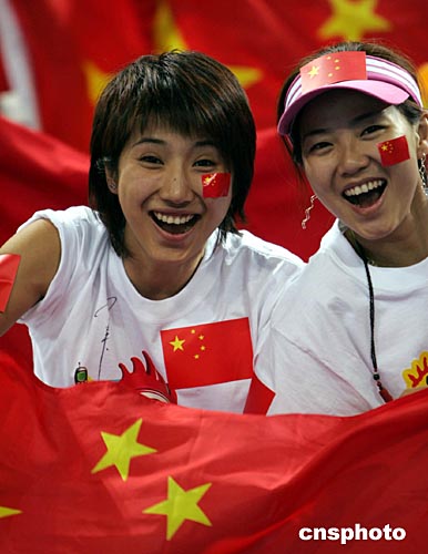 當地時間8月17日,中國男籃在以雅典奧運會小組賽第二場比賽中以69比62艱難戰勝新西蘭隊,兩名來自北京的女球迷到場高喊:“我愛你,中國男籃!”。作者:任晨鳴
