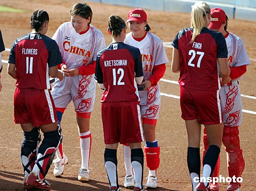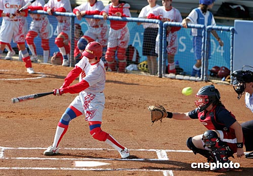 當地時間八月十七日,中國女子壘球隊(白)在雅典奧運會出場迎戰實力強勁的美國隊,一開場就有三名擊球手被封殺出局,最后以0:4失利。中新社記者:任晨鳴