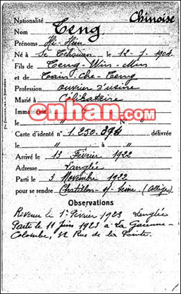 卡片的主要內容為———國籍:中國;姓名:鄧希賢;出生:四川,1904年7月12日(中國農歷———編者注);父親:鄧文明;職業:工廠工人;婚姻狀況:未婚;身份卡號碼:1·250·349;到達日期:1922年2月13日;居住地點:leangle;離開時間:1922年11月3日;目的地:賽納-夏狄戎中學;備注:1923年2月1日重返leangle;1923年6月11日離去,前往拉加雷納-科隆市的德拉普安特街39號。