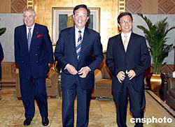 八月十八日,上海市委書記陳良宇(中)、上海市市長韓正(右)在此間會見香港上海匯豐銀行主席艾爾敦一行以及交通銀行代表。會見之前香港上海匯豐銀行與交通銀行舉行股權(quán)交割儀式。匯豐投資一百四十四點六一億元人民幣入股交通銀行百分之十九點九股份,這是迄今為止國際著名金融機構(gòu)入股中國內(nèi)地商業(yè)銀行金額最大、持股比例最高的一次合作。作者:潘索菲