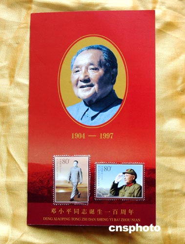 北京市郵票公司為紀念鄧小平誕辰100周年,并配合國家郵政局在2004年8月22日發行《鄧小平同志誕生一百周年》紀念郵票(1套2枚,小型張1枚),特設計印制了這套郵票的首日封、小型張首日封、郵折等郵品,將在8月22日與郵票同時發行。兩枚郵票的名稱分別為:中共中央總書記、中共中央軍委主席,面值均為80分。小型張圖案名稱為:改革開放和現代化建設總設計師,面值6元。中新社記者:鄒憲