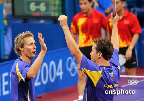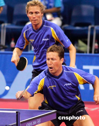 當地時間八月十八日舉行的雅典奧運會乒乓球男雙比賽中,中國選手孔令輝、王皓不敵瑞典老將佩爾森、瓦爾德內爾,無緣晉級八強。中新社記者:張煒