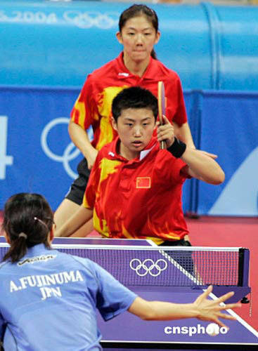 當(dāng)?shù)貢r間八月十八日,在雅典奧運(yùn)會乒乓球女雙1/4決賽中,中國選手郭躍、牛劍鋒以4:2擊敗日本選手福原愛、梅村禮,晉級四強(qiáng)。中新社記者:張煒