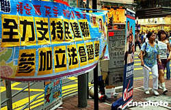 香港2004年立法會選舉在即,民建聯八月十九日在灣仔鬧市街頭懸掛出醒目的標語為參加立法會選舉造勢。中新社記者:錢興強