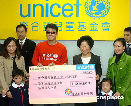 為南亞地震海嘯賑災籌款,聯合國兒童基金會香港委員會副主席陳方安生太平紳士﹑親善大使黎明6日在本部收到香港數家企業的捐款,兒童也到場參與捐款活動,到目前為止已籌得超過4800萬港元。