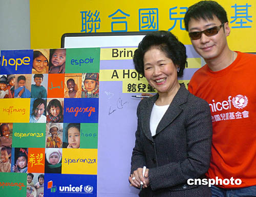 為南亞地震海嘯賑災籌款﹐聯合國兒童基金會香港委員會副主席陳方安生太平紳士﹑親善大使黎明6日在香港呼吁社會為南亞賑災獻愛心。中新社記者:趙振清