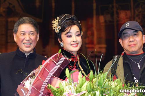 | 根據(jù)臺灣白先勇的作品《金大班的最后一夜》改編而成的同名大型歌舞話劇,一月六日晚在上海上演。著名演員劉曉慶領(lǐng)銜主演,該劇敘述的是上個世紀四十年代至六十年代,從上!鞍贅烽T”到臺北“夜巴黎”的一段風花雪月的故事,講述一位風華絕代的舞女大班金兆麗的傳奇。圖為白先勇(左)向主演劉曉慶及導(dǎo)演熊源偉祝賀。作者:潘索菲