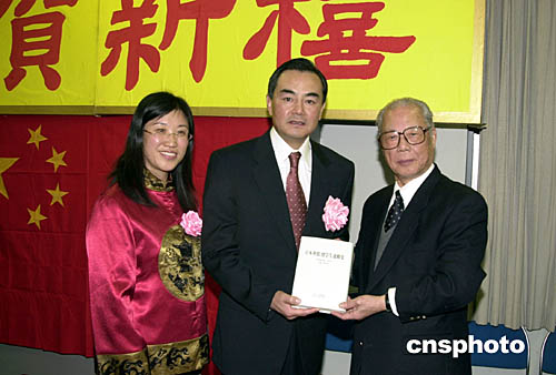 歷經十五年編纂而成的六十萬字的僑史力作《日本華僑·留學生運動史》,日前在東京出版面世。這本凝聚日本僑界心血的歷史專著,填補了在日華僑和留學生史料的大量空白,獲得各界高度評價。圖為該書主編、著名僑領陳焜旺先生(圖右),在八日于東京舉行的日本僑界迎新聯歡會上,向王毅大使(圖中)和中國駐日本大使館總領事于淑媛(圖左)贈送該書。作者:王健