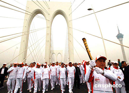 二萬(wàn)多名澳門居民參與該項(xiàng)活動(dòng),他們步行跨越新建的西灣大橋,旨在共同宣傳2005年澳門東亞運(yùn)動(dòng)會(huì)。作者:梁永強(qiáng)