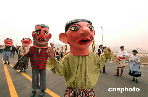 四千多名志愿者和近五萬(wàn)名澳門市民跨越將于九日正式開通的西灣大橋。行政長(zhǎng)官何厚鏵敲響一聲銅鑼,西灣大橋一帶形成一條人的長(zhǎng)龍,場(chǎng)面蔚為壯觀。沿途東亞運(yùn)志愿工作者組成的旗隊(duì)演示了多種旗陣,踩高轎,舞醉龍,銀樂(lè),葡國(guó)土風(fēng)舞和小丑魔術(shù)表演等,高潮迭起。