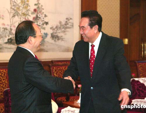 國務院臺灣事務辦公室主任陳云林,一月十日在北京會見由國民黨中央政策會執行長曾永權(圖左)率領的“推動臺商春節包機參訪團”。中新社記者:滿會喬