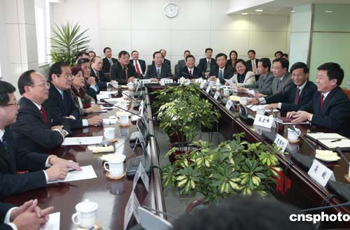 國家民航總局副局長高宏峰(右一)等一月十日在北京與以國民黨中央政策會執行長曾永權(左三)為團長的“推動臺商春節包機參訪團”舉行會談,國民黨籍民意代表章孝嚴(左二)等參加會談。作者:滿會喬