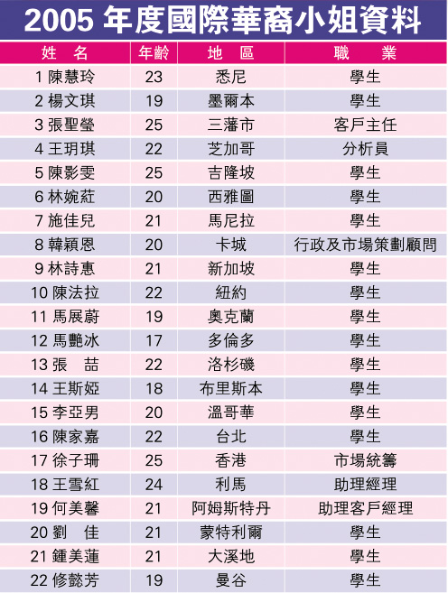 中新網(wǎng)1月11日電 據(jù)香港大公報報道,“2005年度國際華裔小姐競選”于本月二十九日(星期六)舉行,來自世界各地城市合共二十二位候選佳麗,昨日穿上大會安排的低胸連身裙首晤新聞界,并進行號碼抽簽。期間,佳麗特意簽了兩張慰問卡,送給受到南亞海嘯影響的曼谷和吉隆坡佳麗以表慰問。