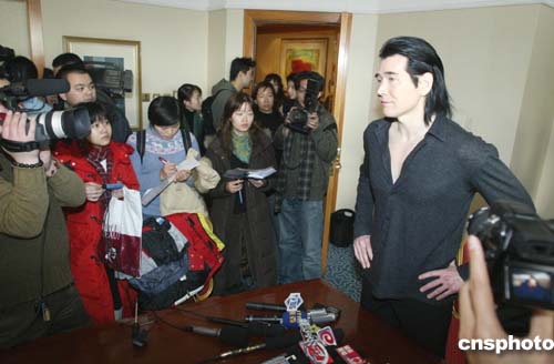 今次專程從臺灣趕來北京的費翔一襲黑衣黑褲,露到胸口的領口不失性感。在發布會上他一再表示,今日只談被誤解的“胸毛賑災”一事,其余話題一概不回答。而記者看到,在發布會全程不管問他新專輯還是將來的工作計劃,他都婉轉地予以回絕。
