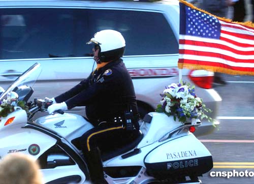 美國各大城市在總統布什就職典禮前夕加強安全保衛,洛杉磯騎警在街頭巡邏。作者:賈國榮