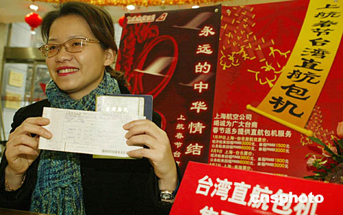 22日上午9時,上海直飛臺灣包機第一名乘客,在上海松江工作的臺中縣梁純滿女士拿到了四張機票,她將乘上海首批航班29日上午8點45分的飛機回臺北的臺中縣和家人團聚過春節。作者:張海峰