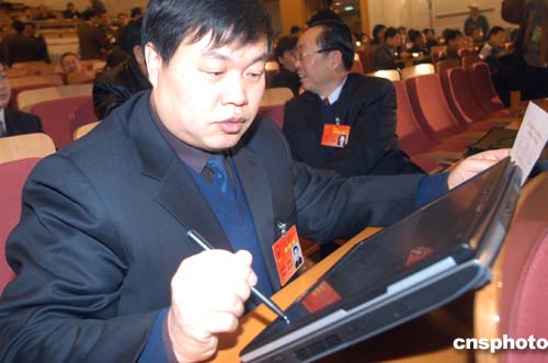 中國第一代程序員、來自石景山區的人大代表朱崇君使用電腦寫各種建議。作者:張宇