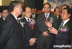 澳門特首何厚鏵一月二十六日訪問廣西,尋求加強合作的新途徑。二00四年,澳門在廣西投資項目共二百八十七個,合同金額二點九四億美元,實際投資金額二點六五億美元,在投資廣西的國家和地區(qū)中,澳門的合同金額和實際投資金額均排第八位。圖為廣西自治區(qū)政府主席陸兵(右一)在向何厚鏵先生介紹情況。作者:蔣雪林