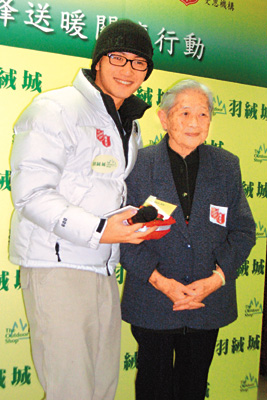 中新網(wǎng)1月27日電 據(jù)大公報報道,謝霆鋒昨日到救世軍出席“送暖關(guān)懷行動”,向長者送羽絨。期間有位婆婆被感動得落淚,霆鋒即時上前安慰,也有婆婆大贊霆鋒有爸爸謝賢的俊朗,又贊其有善心,祝他長命百歲,場面溫馨。