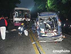 中新社肇慶一月二十七日電(黃耀輝 吳文頌)今天凌晨四時許,國道三二一線廣東高要小湘孔灣路段發生一宗大客車與小客車相碰撞的特大道路交通事故,事故造成小客車上七人當場死亡,一人送醫院途中死亡。