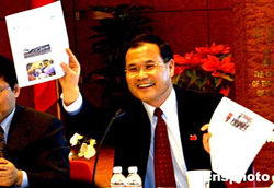圖為中國駐紐約總領事劉碧偉舉著自己從網站上打印下來的有關兩岸春節包機首航成功的報道和紐約華人一起分享喜悅。