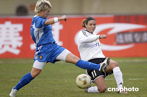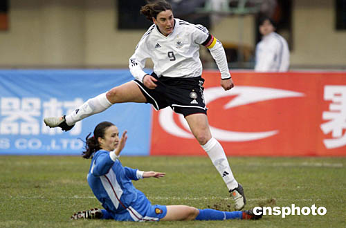 圖為德國女足名將普林茨(右)在比賽中。