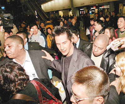 乘坐十多小時機程的基努出閘時略帶倦容,不過仍很友善的向Fans揮手,并上前合照簽名,期間記者蜂擁而上爭相拍照,場面一度混亂,更有女Fans只顧追星連手袋掉在地上也不理。問基努對今次行程有何期望,他說:“希望是一個開心愉快旅程!今次是第一次來香港!”其后他登車往下榻的灣仔君悅酒店,據知酒店方面特別安排了七架專車接送,派頭十足。