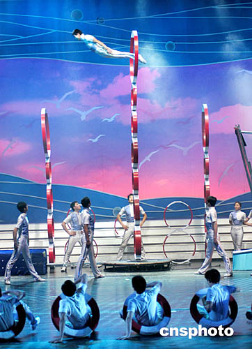 春節(jié)來(lái)臨,解放軍沈陽(yáng)軍區(qū)雜技團(tuán)的演員在2005年軍民迎新春文藝晚會(huì)表演雜技《踏浪飛歌》時(shí),以極度高難的翻騰技巧,準(zhǔn)確地穿越用十個(gè)軍用救生圈直立羅列的高達(dá)九米的鉆圈技巧,展示解放軍勇敢的精神風(fēng)貌。中新社記者:王麗南