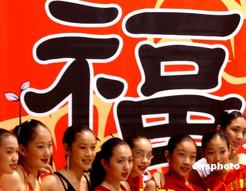 美國洛杉磯一班華人少女聚到高大的福字下,在中國農歷新年前夕先感受喜氣洋洋的氣氛。中新社記者:賈國榮