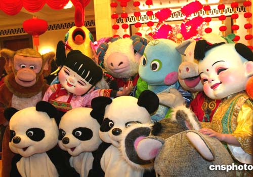 走進張燈結彩的人民大會堂,噴泉涌動,鮮花爭艷,迎面兩個賀歲的“阿福”擁著“壽星”向人們恭賀新喜,彩燈閃爍的“福”字表達著新春的祝福。大型充氣“雞型”、“龍型”滑梯和“燈籠”、“蘑菇”城堡成了孩子們的樂園。