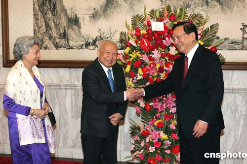 中國國務委員唐家璇二月七日在北京釣魚臺國賓館會見柬埔寨前國王西哈努克。作者:毛建軍