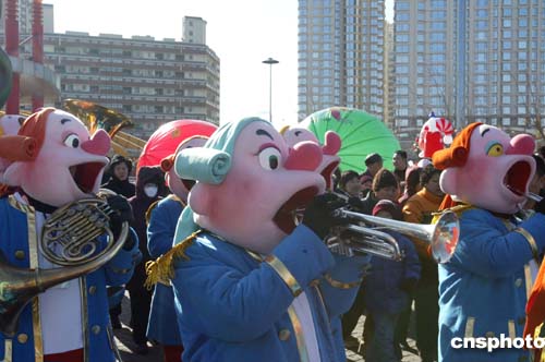 二月九日中國傳統春節,盡管天寒地凍,但是在北京朝陽公園的國際風情節上卻激情燃放。當天開幕的二零零五年北京朝陽國際風情節,為京城的市民奉獻了一臺中西文化大餐。圖為開幕式上盛裝游行隊伍中的卡通樂隊。作者:任海霞