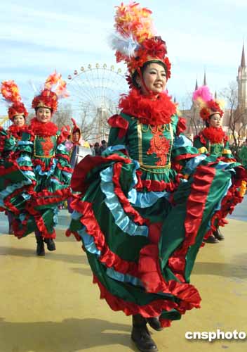 二月十日農歷大年初二,北京石景山游樂園為北京百姓奉獻一道節日大餐——第五屆北京洋廟會。圖為身著艷麗西班牙節日盛裝的姑娘們,在石景山游樂園推出的特色品牌活動——花車行進表演中載歌載舞。作者:張勤