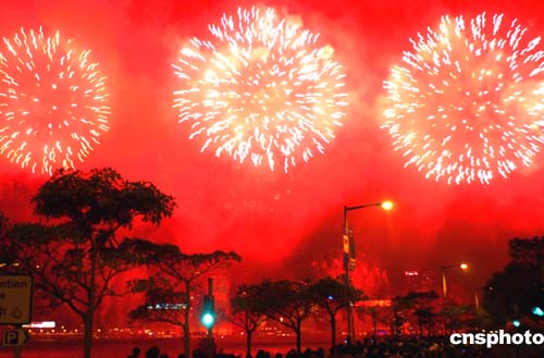 中新社香港二月十日電(記者黃少華)各式寓意吉祥的煙花圖案相繼在維港上空綻放,兩岸喝采聲、驚嘆聲此起彼伏。今晚八時起,歷時二十三分鐘的香港煙花匯演,發放了二萬二千八百八十八枚煙花,給四十萬市民和游客帶來了美的享受與歡樂。