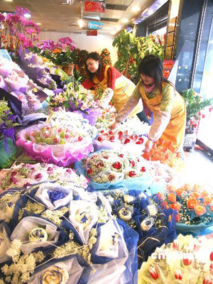 2月14日是“情人節”,南京各大花店準備制作的百合、玫瑰、郁金香等各種手捧鮮花,已擺滿了店堂,供情侶們前來挑選。圖為太平北路一家花店的員工在忙著擺放剛制作的手捧鮮花。作者:谷昌旺