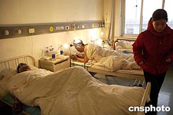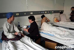 遼寧阜新礦業集團海州立井“二·一四”特大事故發生后,搜救人員又搜尋到六具失蹤礦工的遺體,截至十六日早上,遇難礦工人數上升到二百零九人,受傷人數二十九人,仍有六人失蹤。目前共有二百零四具遇難礦工遺體升井,井下五具已確定具體位置。圖為在阜新礦業集團總醫院接受治療的礦難傷者。作者:盛佳鵬