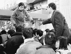 10時(shí)左右,人越來越多,市場前的紅旗路上人擠著人,綿延1公里,抬腳都困難,人群中不斷傳出被踩到腳的尖叫聲,10分鐘時(shí)間里,記者愣是沒走出200米。汽車、自行車和小商販的三輪車夾在人群中間動(dòng)彈不得,209路公交車無奈只好改線,一位乘客嘟囔著:“早就該實(shí)行交通管制。”雖然主辦方明確規(guī)定不得在場外招聘,可路邊的“招聘”牌子還是一個(gè)挨著一個(gè),散發(fā)的各種小廣告隨地可見,5元一張的門票被炒到10元。