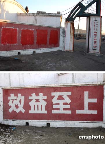 | 發(fā)生特大礦難的遼寧阜新孫家灣煤礦礦區(qū)的大幅標(biāo)語日前被涂抹遮蓋。上圖顯示“效益至上”的標(biāo)語被涂抹遮蓋;下圖顯示“效益至上”標(biāo)語未被涂抹前十分醒目。二月十四日發(fā)生的孫家灣煤礦特大礦難,已知造成二百一十四名礦工死亡,是四十多年來中國煤礦礦難事故死亡人數(shù)最多的一次。作者:中新社