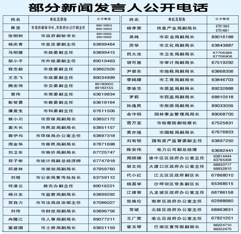 據(jù)介紹,重慶市如今共有140位政府新聞發(fā)言人。此次公布的,包括市政府、60個(gè)市級(jí)政府部門以及40個(gè)區(qū)(市)縣政府的新聞發(fā)言人的公開(kāi)電話。