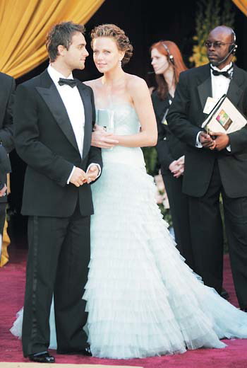 上屆影后查理茲·塞隆的著裝,遠(yuǎn)比去年她拿獎時的那身出彩,淡青色的雪紡料長裙,既貼身又下垂,正好將她曼妙的身材凸顯得玲瓏有致;低胸的設(shè)計,再配上同色的薄紗做點綴,顯得明快生動;裙的下部是層層擴大的荷邊式下擺,裙尾略有拖地,恰到好處地彌補了塞隆腰短的缺點,空靈飄逸,幽雅高貴,整體效果非常出眾。