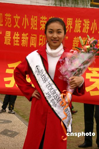 中新社南寧三月二日電(記者 劉萬強)中國第一個世界旅游小姐大賽獎項得主——廣西貴港姑娘范文,今天載譽歸來,在南寧國際機場受到家鄉親朋的熱烈歡迎。