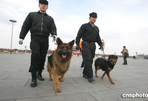 全國政協十屆三次會議三日下午在北京人民大會堂開幕,大會開始前警方對人民大會堂周圍場所進行例行安檢。作者:湯彥俊