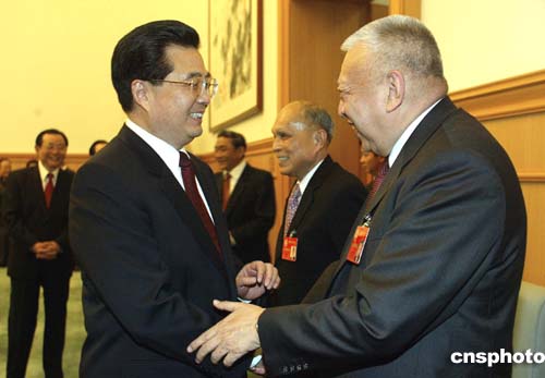 全國政協十屆三次會議三月三日在北京開幕,國家主席胡錦濤在大會開幕前與香港特首董建華互致問候。作者:廖文靜
