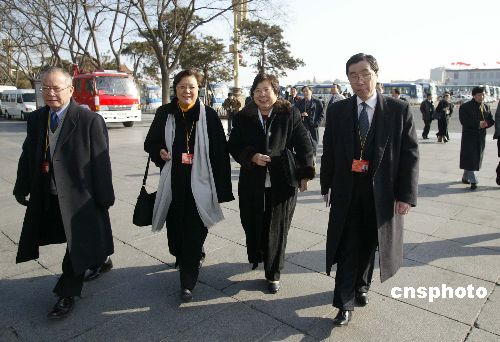 三月四日,十屆全國人大三次會議在北京召開預備會議,全國人大代表、香港特別行政區立法會主席范徐麗泰(左二)與其他香港代表步入人民大會堂。作者:廖文靜