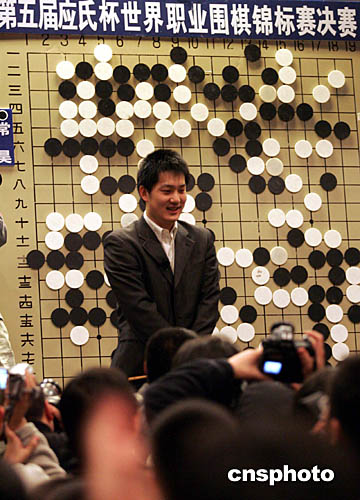 二零零五年三月五日,中國棋手常昊在北京舉行的第五屆應氏杯圍棋錦標賽中以3:1戰勝韓國選手崔哲瀚,奪得其個人職業生涯的首個世界冠軍頭銜,同時也是中國棋手首次在該賽事中奪冠。圖為常昊獲勝后向現場觀戰的觀眾致謝。作者:武仲林