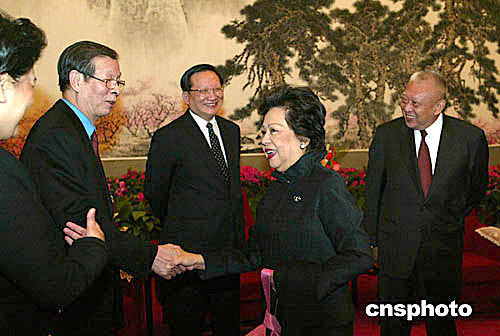 國家主席胡錦濤三月五日在北京會見香港特別行政區行政長官董建華,國務委員唐家璇、國務院港澳辦主任廖暉等在會見后與特首夫人互致問候。作者:滿會喬