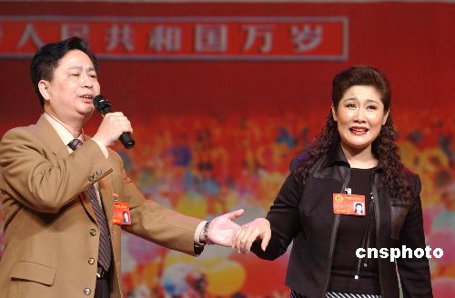 出席十屆全國人大三次會議的湖北、湖南、遼寧、臺灣代表,三月五日晚在駐地北京五洲大酒店舉行聯(lián)誼會,湖北代表劉丹麗(右)與臺灣代表何大欣共唱一首民歌《月之故鄉(xiāng)》,慶祝大會開幕。作者:毛建軍