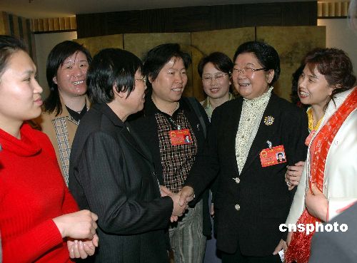 圖:顧秀蓮到山東團向女代表祝賀節(jié)日
